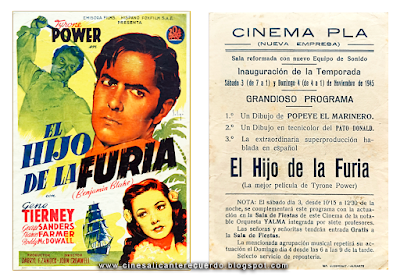 Programa de mano del Cinema Pla (Nueva Empresa) en la calle Barcelona del popular barrio del Pla. Proyección de la película El Hijo de la Furia de John Cromwell con Tyrone Power, 3 y 4 de noviembre 1945. Se complementara este programa con la actuación en la Sala de Fiestas de este Cinema de la Orquesta Yalma integrada por siete profesores. (Colección Lorenzo Guardiola).